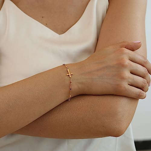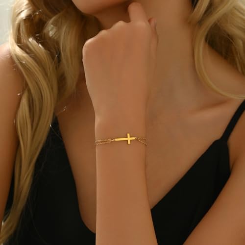 MONOZO 女款十字架項鍊 - 14K 鍍金十字架項鍊 多層金色十字架項鍊 小巧側向十字架項鍊 金色十字架項鍊 女款 時尚 金色 珠寶禮物 送給女性 女孩