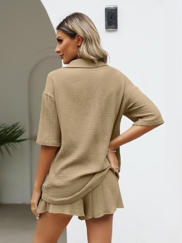 AUTOMET 2 Piece Outfits For Women Lounge Sets Pajama Sets Long Sleeve Button Down Oversized Shirts And Shorts Fall Tracksuit