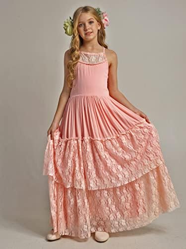 BIBIHOU 女孩兒童蕾絲背部全長露背薄紗派對假日正式花童洋裝