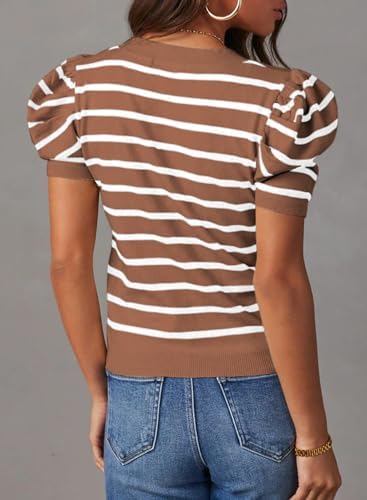 Dokotoo 女款短袖泡泡袖針織上衣 2024 時尚圓領條紋 T 恤休閒夏季襯衫