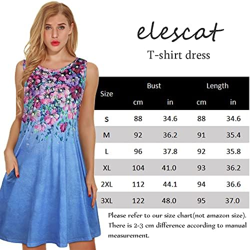 elescat 女款 夏季洋裝 2024 休閒 海灘 無袖 印花 背心 寬鬆裙 附口袋