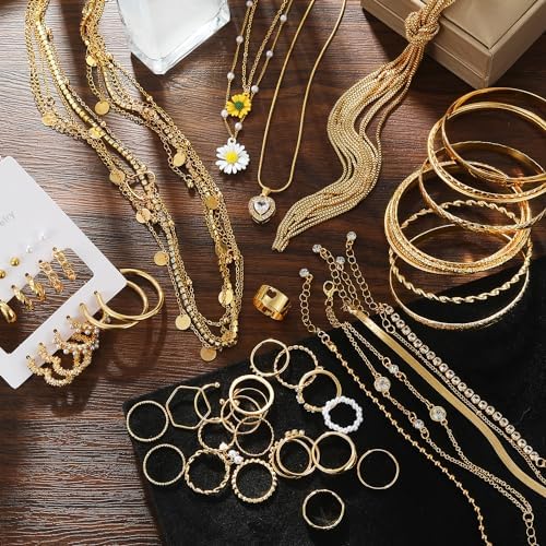 IFKM 36 件鍍金珠寶組,附 4 件項鍊,11 件手鍊,7 件耳環,14 件指關節戒指,適合女性 女孩 情人節 週年紀念 生日 友誼禮物