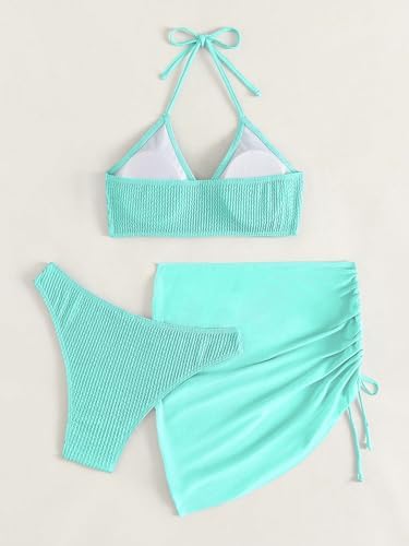 MakeMeChic Women's 3 Piece Bathing Suits Halter Ring Bikini Set with Cover Up Skirt