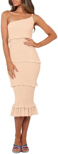 PRETTYGARDEN Womens Floral Summer One Shoulder Strappy Tiered Ruffle Midi Bodycon Dresses