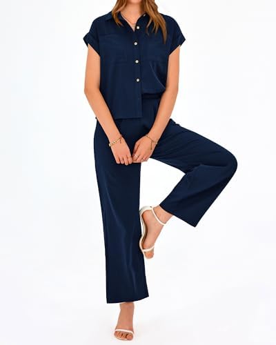 PRETTYGARDEN Womens Short Sleeve Button Down Shirt Long Pant Lounge Set