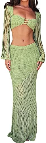 Sawden Women Y2k Crochet Knitted Two Piece Outfits Hollow Out Cami Top and High Waist Mini Skirt Beach Wear